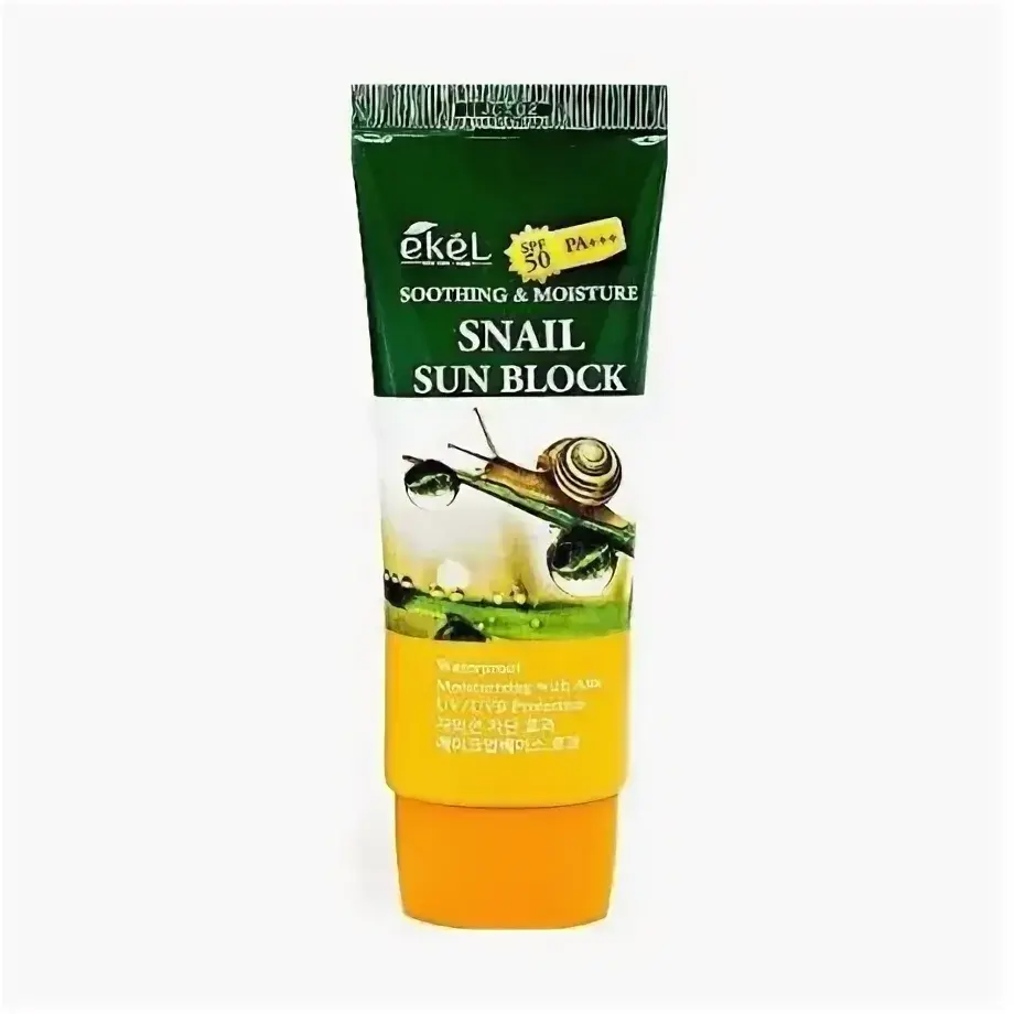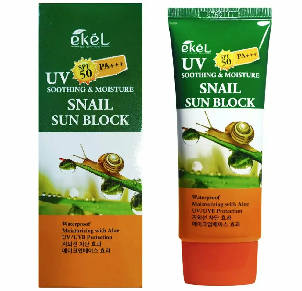 Корейский солнцезащитный крем для лица Ekel Soothing & Moisture Sun Block SPF50/PA+++ Snail с улиточным муцином это средство от UVA и UVB лучей, которое предотвращает обезвоживание кожи, вызванное пребыванием на солнце.