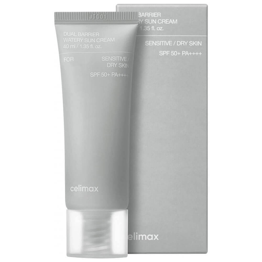 Солнцезащитный крем с комплексом церамидов Celimax Dual Barrier Watery Sun Cream SPF50+PA++++на основе минеральных фильтров интенсивно увлажняет, укрепляет гидролипидный барьер, поддерживает микробиом. Уменьшает раздражение и стимулирует регенерацию.