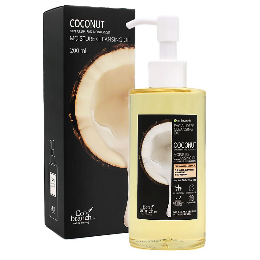 Eco Branch Coconut Moisture Cleansing Oil – это органическое гидрофильное масло с кокосом предназначено для глубокого очищения. Масло эффективно удаляет все виды загрязнений, остатки макияжа, излишки кожного сала, проникает глубоко в поры и растворяет жировые пробки. Натуральные составляющие продукта наполняют кожу питательными и увлажняющими компонентами, не вызывают сухости и раздражений.