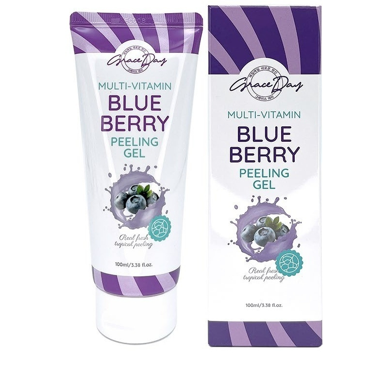 Отшелушивающий пилинг-гель для лица с экстрактом черники Multi-Vitamin Blueberry Peeling Gel южнокорейского бренда Grace Day на основе пантенола, аллантоина, аргинина, витаминов С и Е, экстрактов тростника и солероса оказывает очищающее и ухаживающее действие. Он образует мягкие целлюлозные катышки, которые бережно отшелушивают верхний ороговевший слой кожи, убирают загрязнения и улучшают её состояние. Средство не травмирует кожный покров, не вызывает сухости и стянутости, смягчает, увлажняет, питает и разглаживает кожу, уплотняет её, тонизирует и освежает.