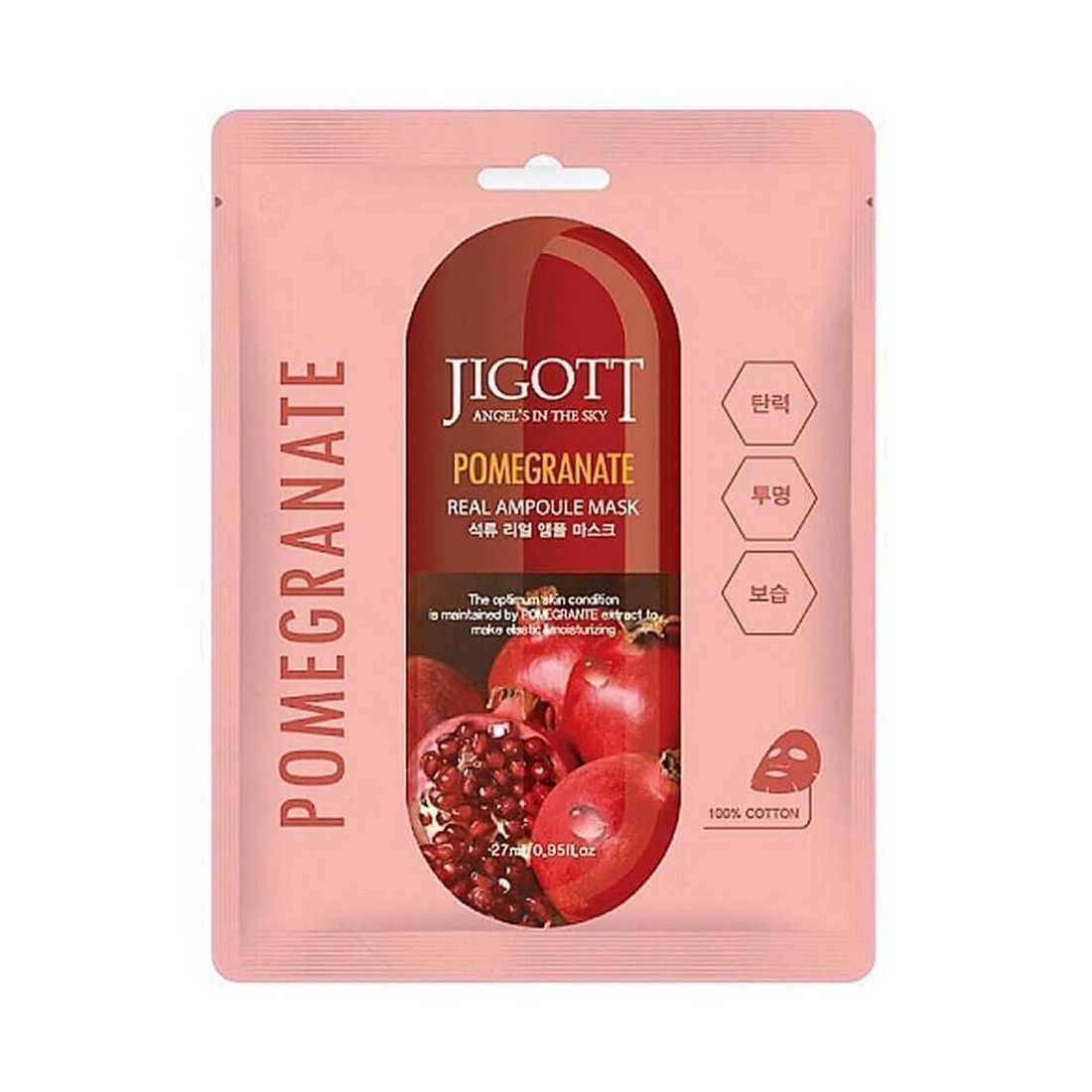 осстанавливающая тканевая маска для лица POMEGRANATE REAL AMPOULE MASK от корейского бренда JIGOTT богата натуральными антиоксидантами. Основной действующий компонент гранат омолаживает кожу изнутри, помогает отсрочить появление морщин. Сразу после первого применения кожа на лице преобразится: станет гладкой, мягкой на ощупь и сияющей. Использование тканевых масок курсом поможет избавиться от пигментных пятен, морщин, прыщей и сального блеска.