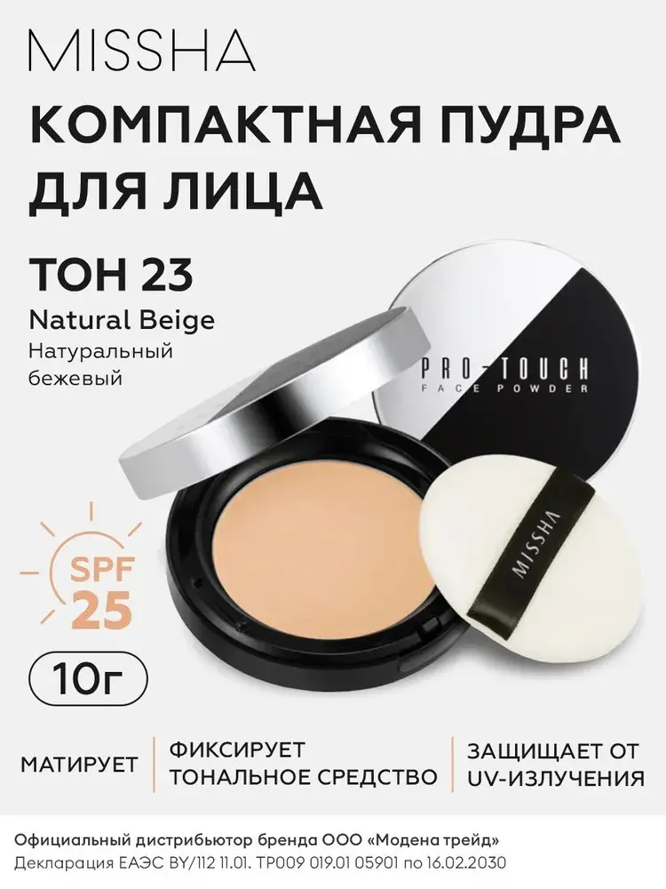 Компактная спрессованая пудра Missha Pro Touch Powder Pact SPF 25 PA++ придаёт коже сияние, создаёт натуральное гладкое покрытие, не подчёркивает шелушение и не западает в морщинки. Компактный формат отлично подходит для обновления макияжа в любом месте.