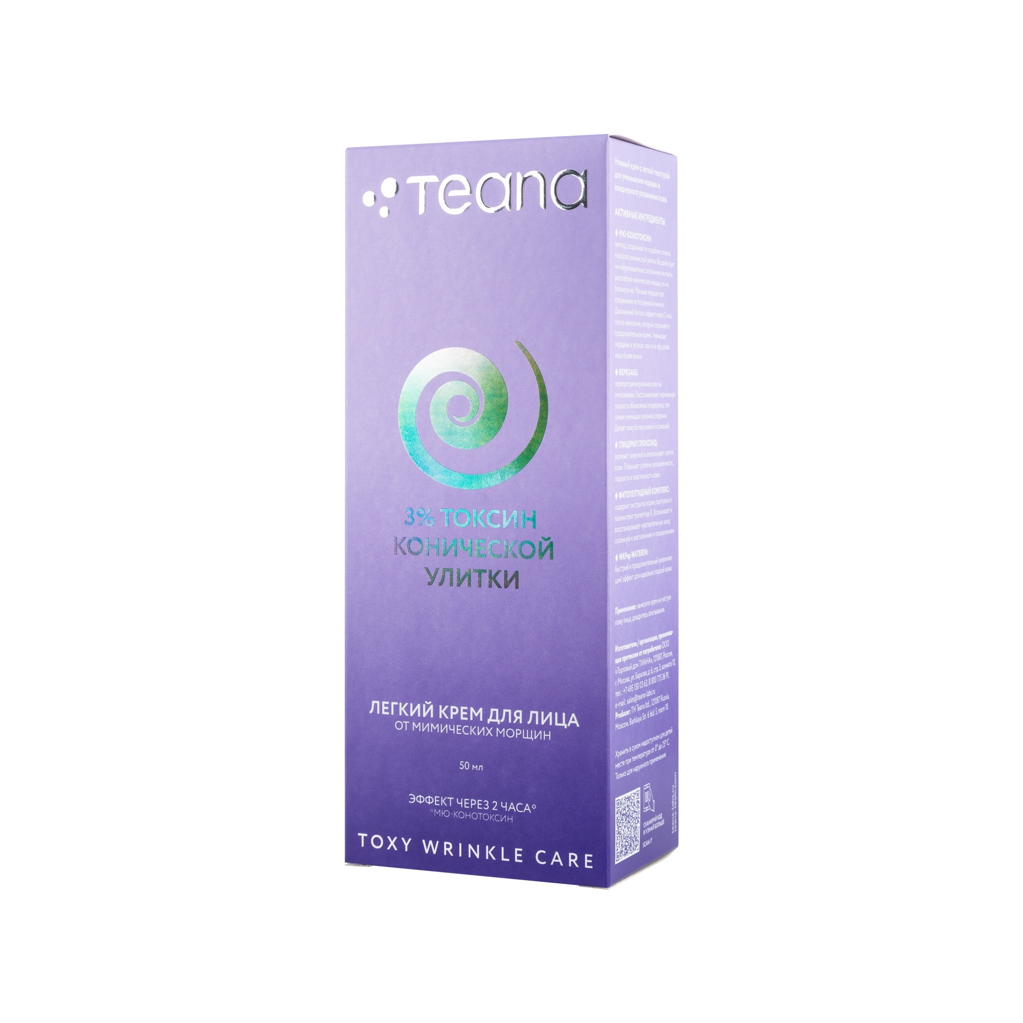 Мю-конотоксин: пептид, созданный по подобию токсина морской конической улитки. Воздействует на нейромышечные сигнальные контакты, расслабляя мимические мышцы, но не блокируя их. Меньше морщин при сохранении естественной мимики. Доказанный ботокс-эффект через 2 часа после нанесения, который сохраняется продолжительное время. Уменьшает морщины в уголках глаз и на лбу, делая лицо более юным.