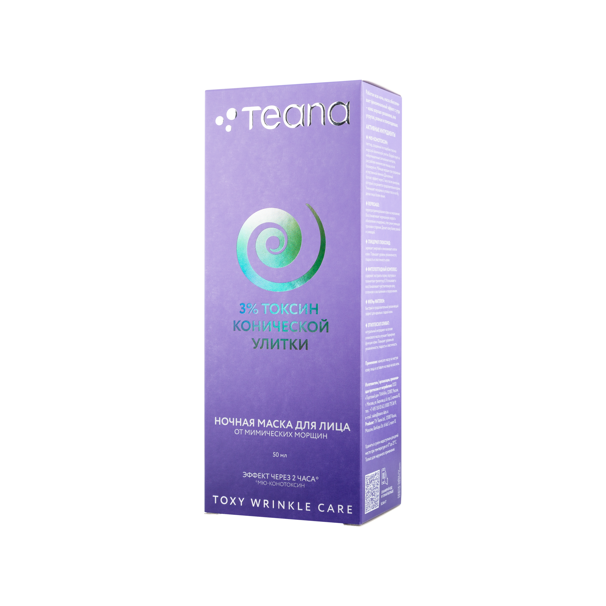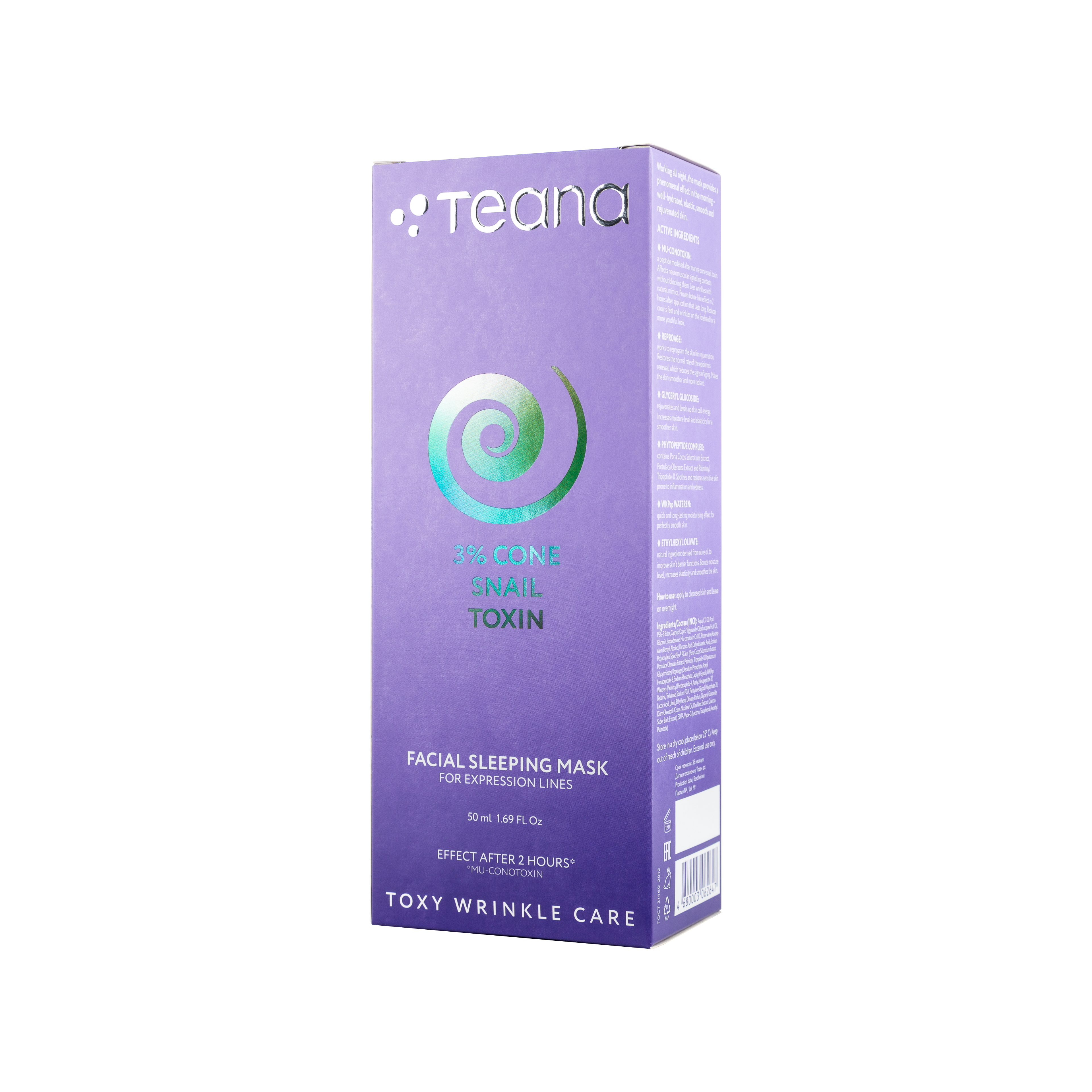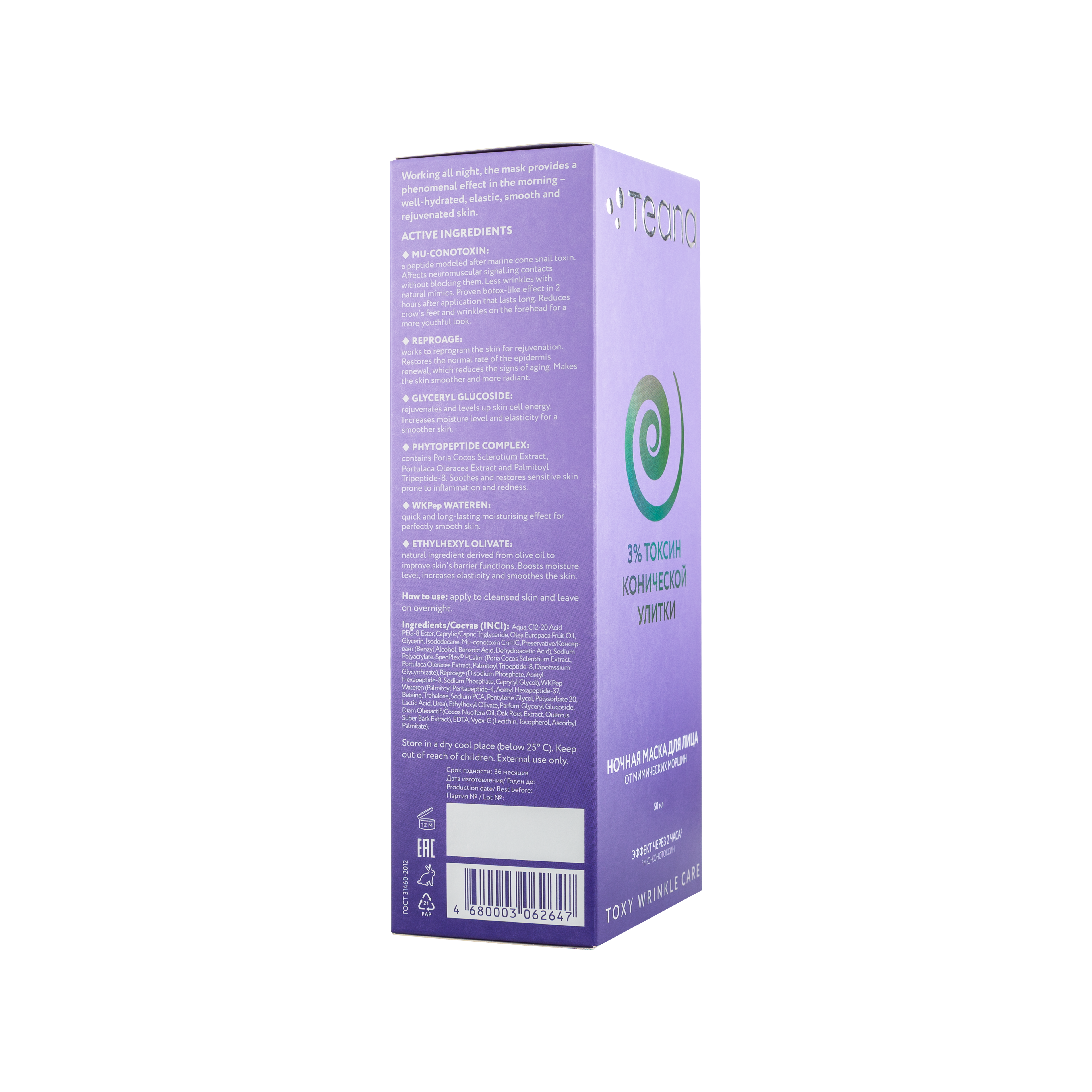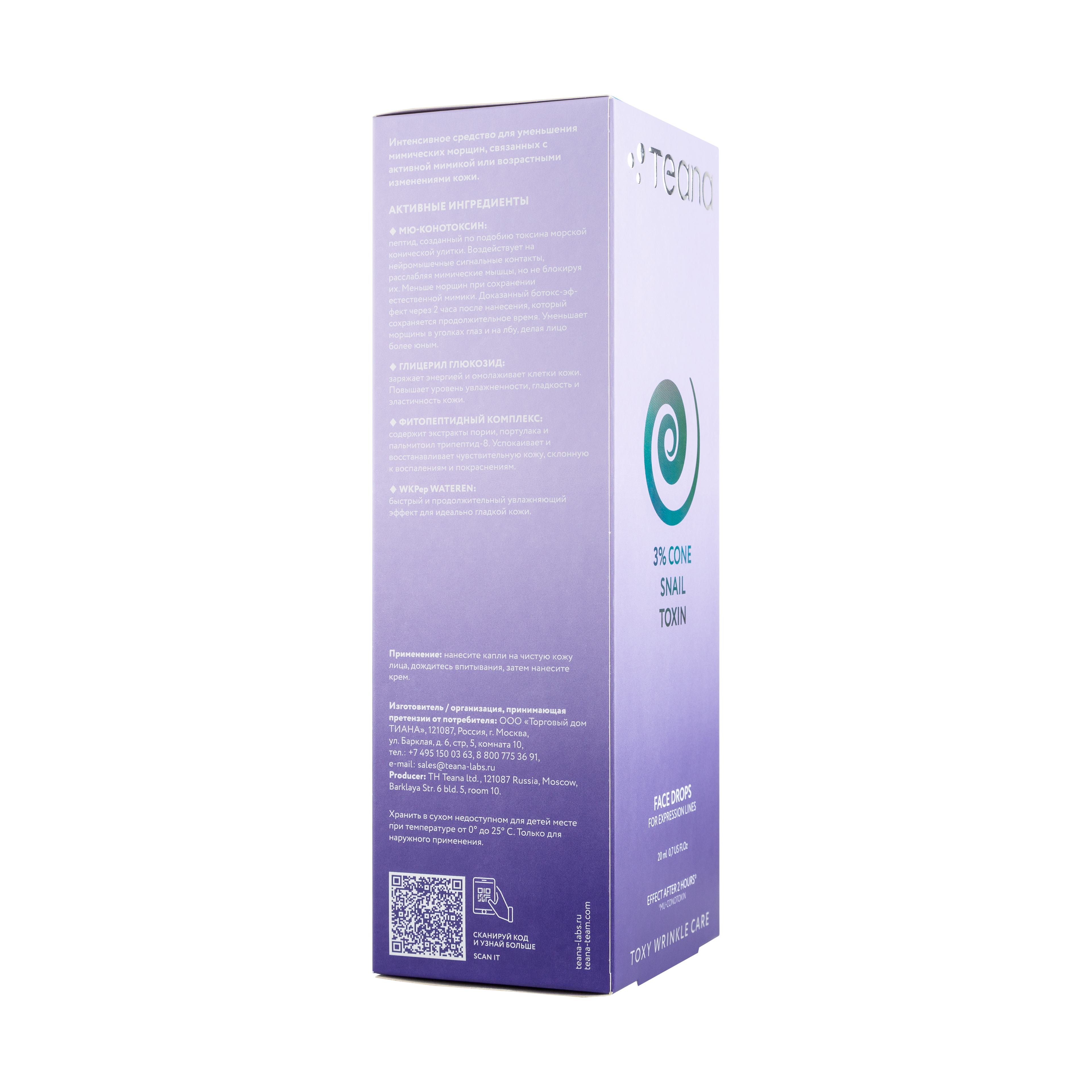 Мю-конотоксин: пептид, созданный по подобию токсина морской конической улитки. Воздействует на нейромышечные сигнальные контакты, расслабляя мимические мышцы, но не блокируя их. Меньше морщин при сохранении естественной мимики. Доказанный ботокс-эффект через 2 часа после нанесения, который сохраняется продолжительное время. Уменьшает морщины в уголках глаз и на лбу, делая лицо более юным.