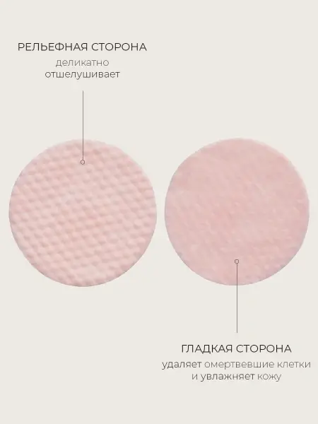 Диски имеют две стороны: рельефную отшелушивания и гладкую, помогающую убрать с поверхности эпидермиса омертвевшие клетки и интенсивно увлажнить кожу.